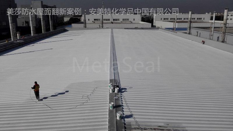 位于上海市青浦開發(fā)區(qū)的安美特化學(xué)(中國)有限公司青浦分公司,總屋面面積7000平方米,使用10年后,采用美莎金屬屋面翻新體系,進行系統(tǒng)維護。即先局部除銹打磨,涂飾環(huán)氧樹脂防腐油漆;屋脊/天溝/采光窗等部位用美莎金屬屋面防水體系“一布三涂”局部防水加強處理;土建女兒墻用薇妮土建屋面防水涂料進行整體涂飾;然后屋面上用美莎隔熱反光涂料(第二代),整體噴涂2遍,隔熱節(jié)能降溫,防水防腐,系統(tǒng)翻新。