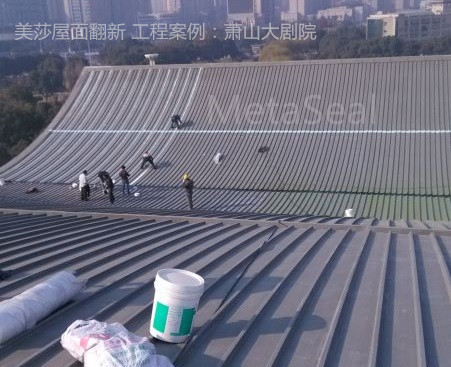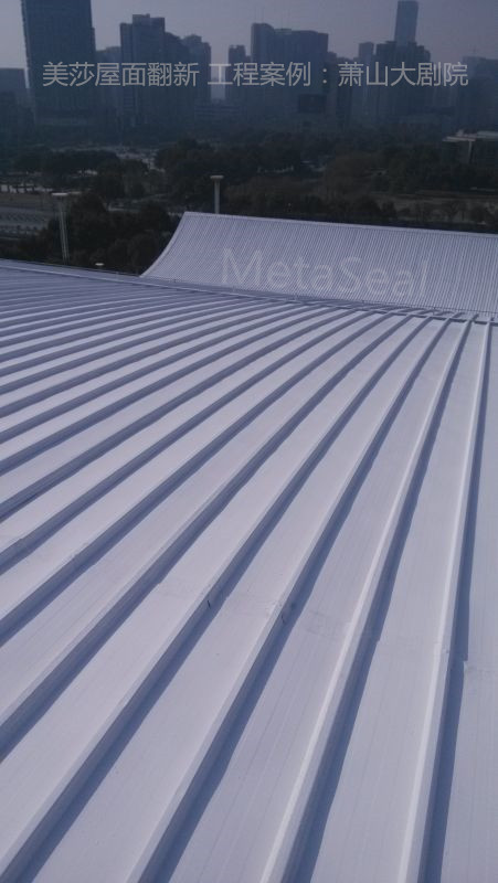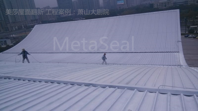 位于杭州市蕭山區(qū)的政府項目——蕭山大劇院,使用7-8年后,大劇院出現(xiàn)了不同程度的滲漏水,屋面及外立面也呈現(xiàn)老舊狀況。經(jīng)過嚴格的招投標流程后,屋面翻新采用美莎金屬屋面防水體系+翻新體系,即將所有搭接縫進行防水密閉處理后,整個屋面噴涂美莎隔熱反光涂料(第二代),維護后煥然一新,效果明顯。