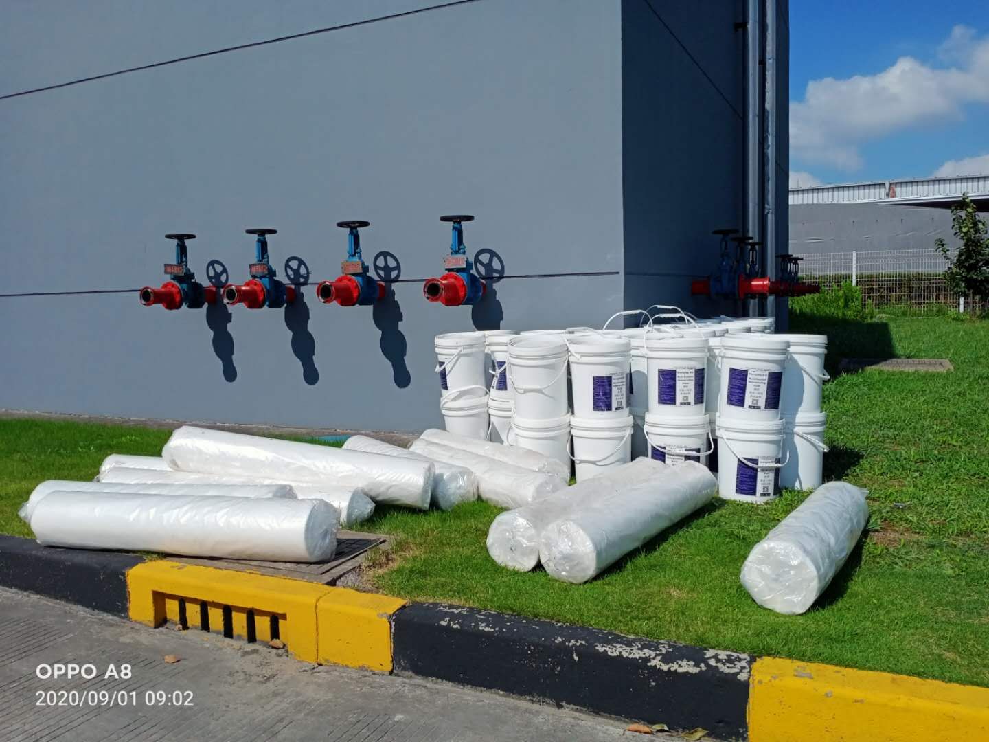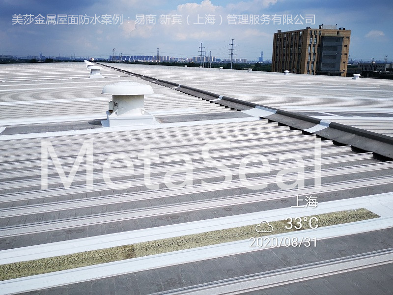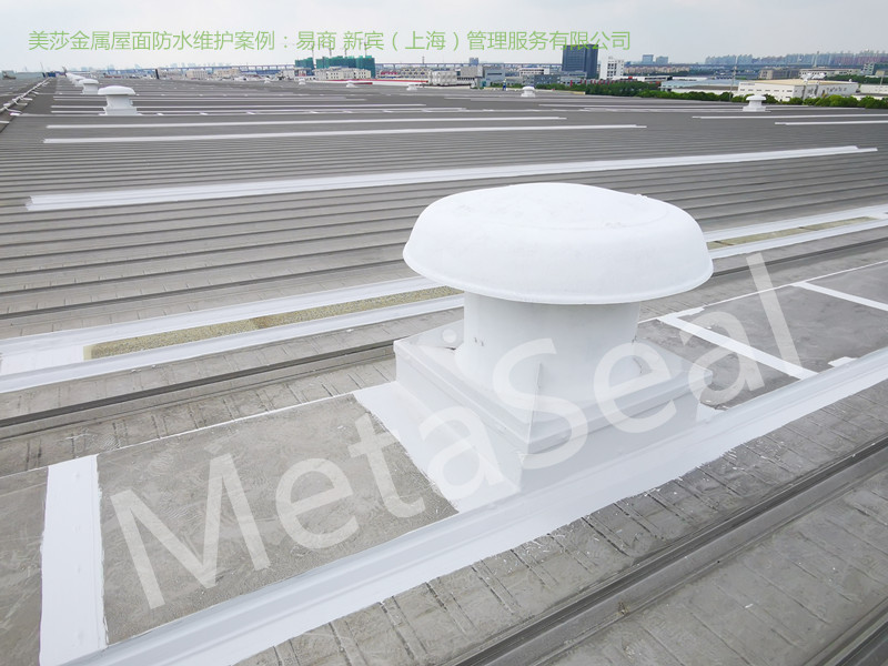 位于上海松江新區(qū)的易商新賓項目,標準倉儲基地2萬平方米。今年夏天,彩鋼屋面定期進行防水維護,將采光板四周搭接縫、風機基座、以及上游泛水蓋板搭接縫等,采用美莎金屬屋面防水體系,“三涂一布”標準工藝,進行了系統(tǒng)防水維護施工,確保屋面無滲漏水隱患。