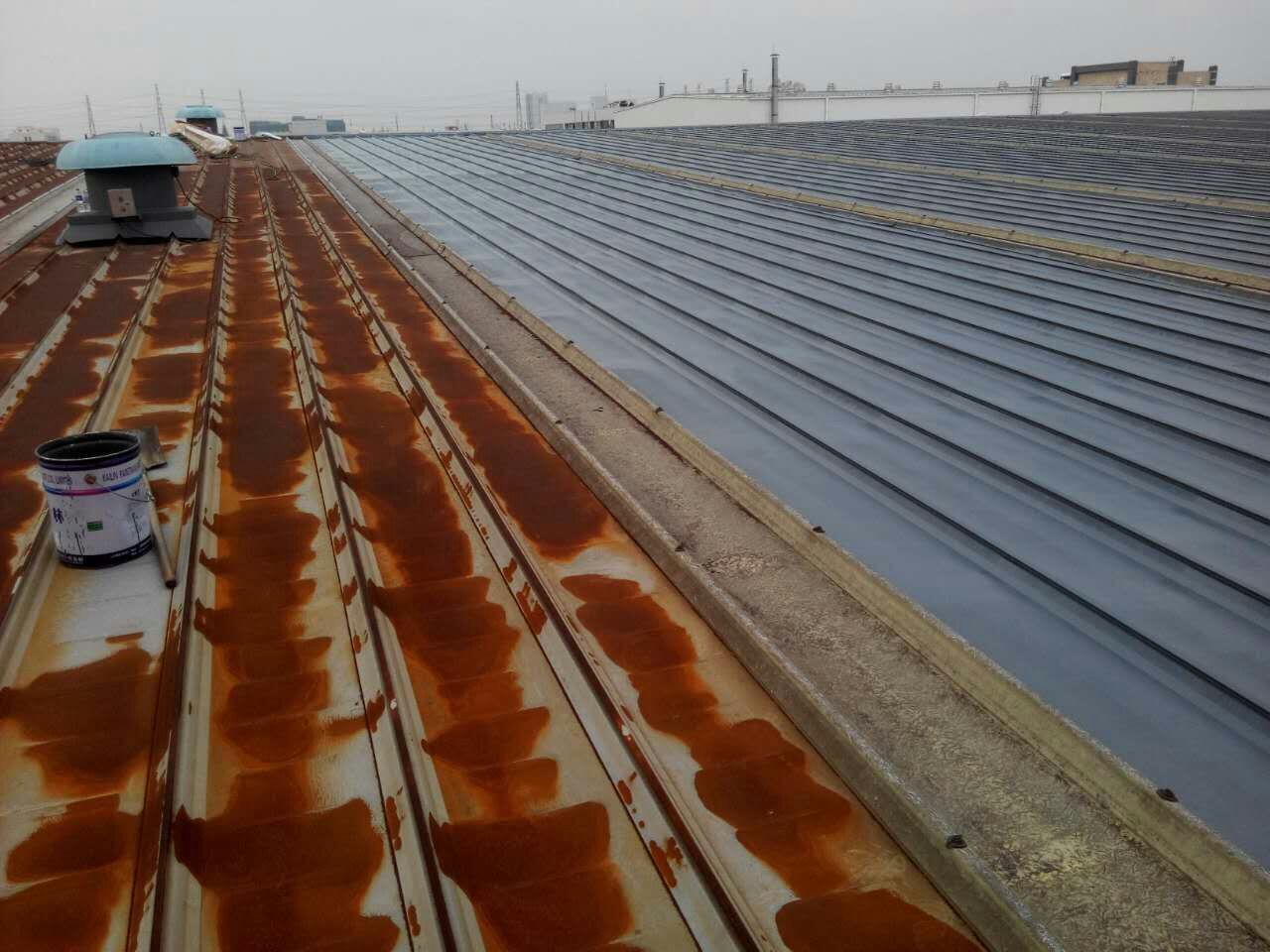 為避免屋面板今后銹蝕爛穿,造成不得不更換屋面板的不利局面(代價更高,且會影響正常運營),業(yè)主委托上海榮拓實業(yè)有限公司/美莎屋面維護,對屋面進行整體維護保養(yǎng),徹底解決了銹蝕問題及滲漏水問題;對于窟窿破損等問題也進行修復加固,對所有易滲漏水的屋脊、采光板搭接縫、風機基座、山墻搭接縫、天溝等進行防水密閉處理;再整體噴涂美莎全能型的保護涂料(集防水防腐隔熱保護于一體)。確保屋面5-10年內不會再有漏水銹蝕等問題出現(xiàn)。