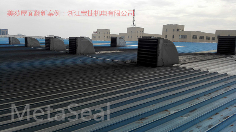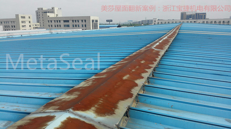 位于浙江省海寧市開發(fā)區(qū)的浙江寶捷機電有限公司,為一德國獨資企業(yè)。生產(chǎn)車間為一棟鋼結(jié)構(gòu)標準廠房,建筑面積14800平方米。由于生產(chǎn)車間排放的工業(yè)廢氣及粉塵(屋面后開了10個排風(fēng)設(shè)備),對于屋面板產(chǎn)生腐蝕性。在使用五六年后,屋面出現(xiàn)不同程度的滲漏水情況及銹蝕情況,且日趨嚴重。之前業(yè)主曾找外面的防水施工單位,就通風(fēng)設(shè)備區(qū)域用SBS瀝青防水卷材進行鋪設(shè),一年后又滲漏水了,維修效果不理想。