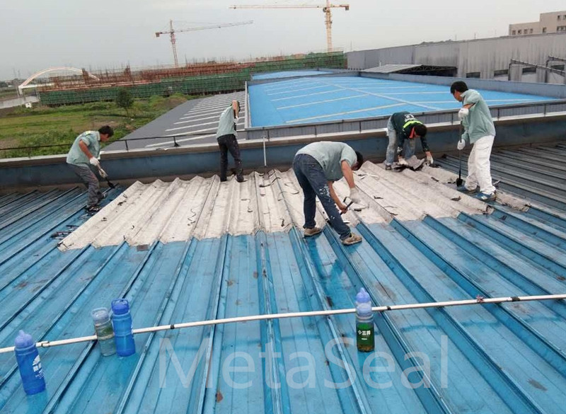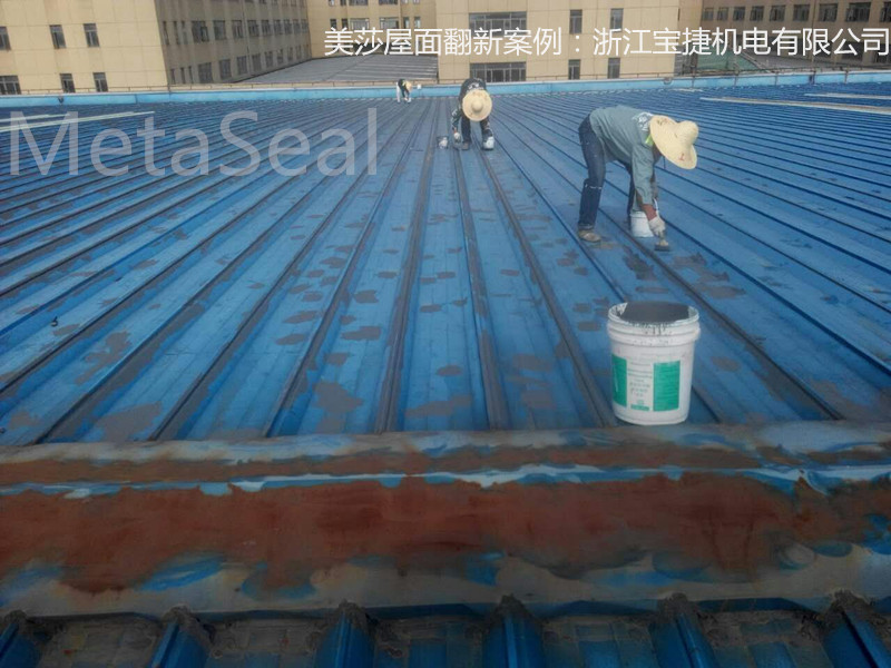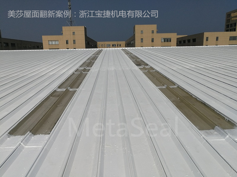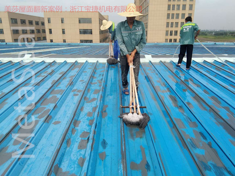 對于屋面上的屋脊、采光帶、釘子、通風(fēng)器基座、泛水收邊、避雷帶、天溝等易滲漏部位采取MetaSeal美莎金屬屋面防水體系進行防水維護加固處理。包括美莎多功能防水底涂 +防水聚酯布+防水底涂,干燥后再刷一層美莎防水面涂,形成一個連續(xù)的、密封的防水層,全干后防水層的總厚度約為1.1-1.2mm。