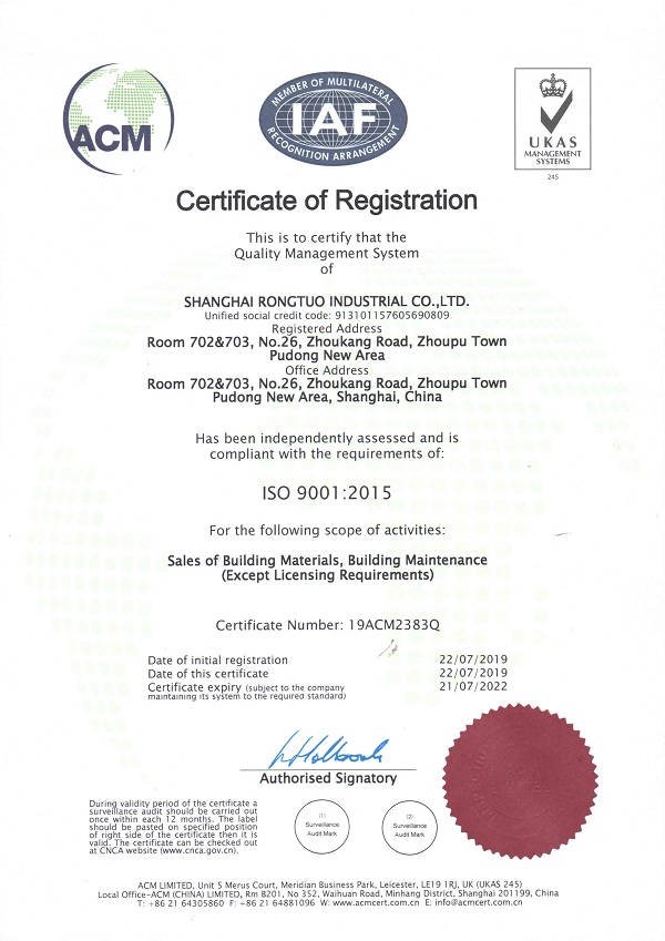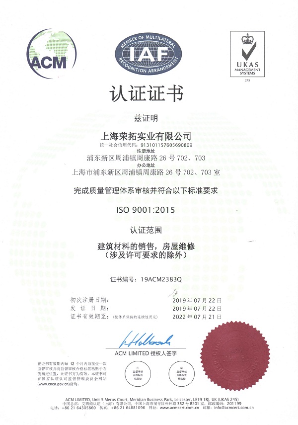 公司也于7月22日收到了新的ISO9001:2015的證書。