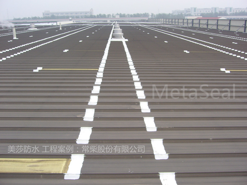 常柴股份公司多缸機(jī)廠房采用鋼結(jié)構(gòu)屋面,屋面面積約3萬(wàn)平方米,建成至今已有近7年時(shí)間。由于鋼結(jié)構(gòu)屋面跨度大,屋面板連接處的膠泥、硅膠等材料老化,局部釘子松動(dòng)銹蝕,在竣工后5年左右時(shí)陸續(xù)出現(xiàn)多處漏水現(xiàn)象,已影響到工廠機(jī)器設(shè)備的正常運(yùn)用及日常生產(chǎn)。為了解決這些問題,業(yè)主曾采用SBS瀝青防水卷材對(duì)于漏水區(qū)域進(jìn)行滿鋪維修,但效果很不理想,公司在咨詢屋面專業(yè)人士后,決定采用MetaSeal美莎金屬屋面防水體系,對(duì)于屋面上的各板搭接縫部位、屋脊、風(fēng)機(jī)座、排煙(氣)管部位、天溝等部位進(jìn)行系統(tǒng)地防水維護(hù),收到了良好的效果。