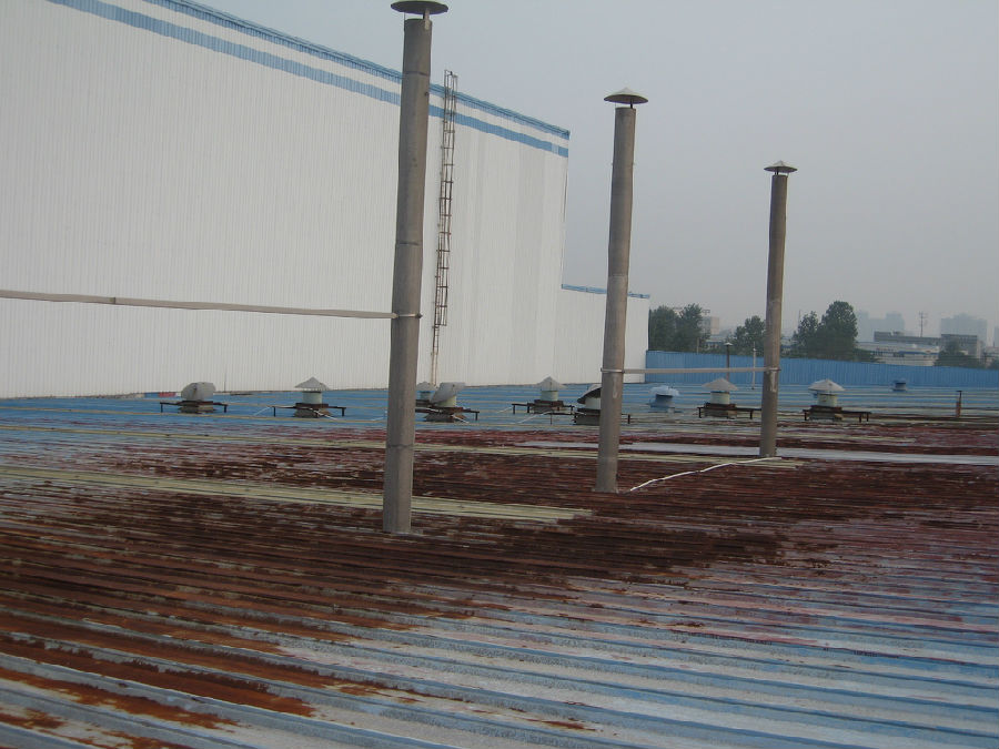 當(dāng)生產(chǎn)車(chē)間的同事反饋說(shuō),屋面滲漏水很?chē)?yán)重,影響到正常生產(chǎn)。等到上屋面實(shí)地勘察,發(fā)現(xiàn)問(wèn)題已非常多,彩鋼屋面已嚴(yán)重銹蝕,金光閃閃的,天溝里到處都是垃圾,排水孔堵塞,有的甚至已長(zhǎng)出了很長(zhǎng)的雜草。