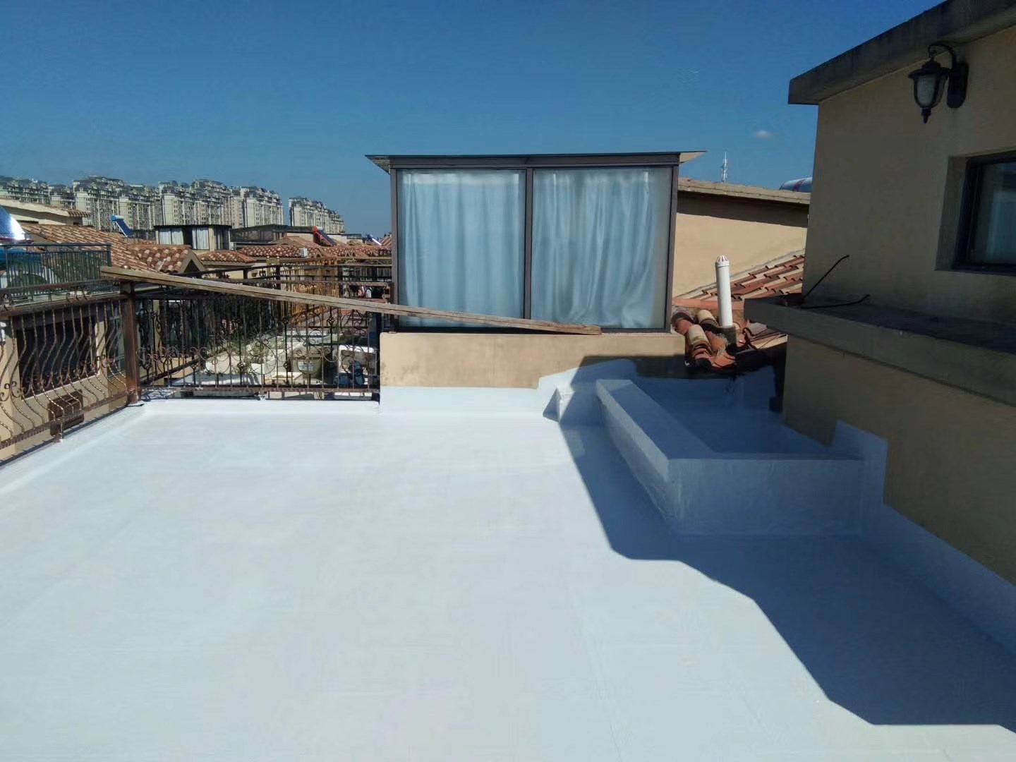 (4)牢固的粘結(jié)力,可以在在各類基面上都能做(磚瓦、混凝土、彩鋼板、鋼化玻璃、瀝青卷材等);