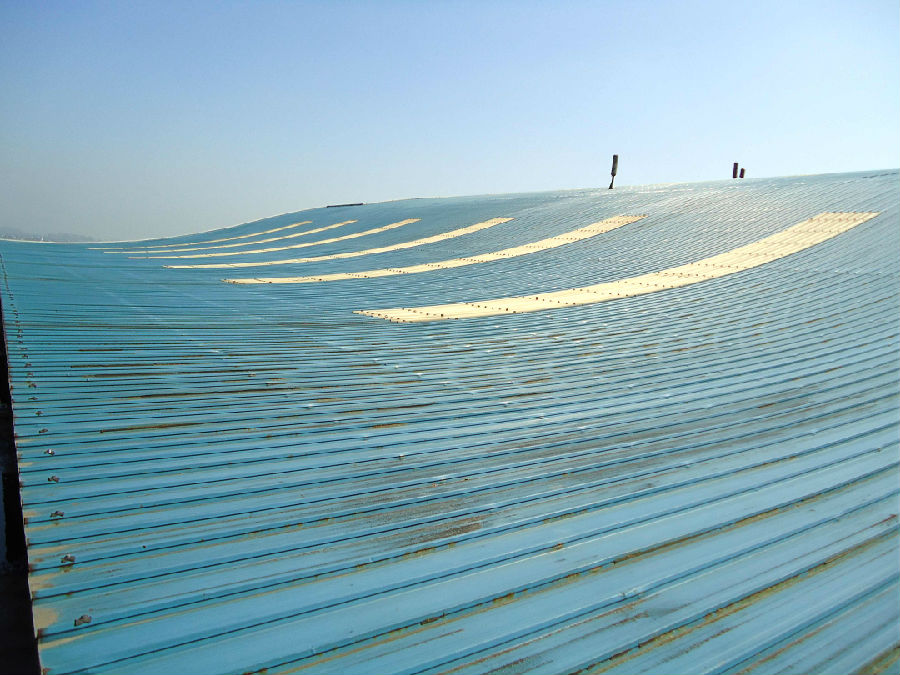 (3)鋼結(jié)構(gòu)彩鋼屋面防水中,屋面板因跨度過大,許多情況下屋面板存在搭接過程,雖然在搭接等處采用了密封膠和縫合釘?shù)忍幚,安裝每每很難達(dá)到設(shè)計(jì)理論標(biāo)準(zhǔn),導(dǎo)致漏雨。